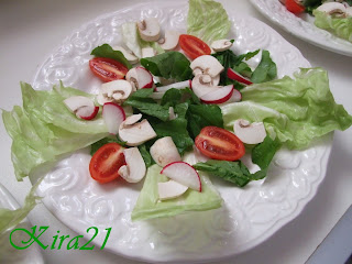 A tanyerokon elrendezem a tisztitott es darabokra vagott salatat, rukolat, paradicsomot,